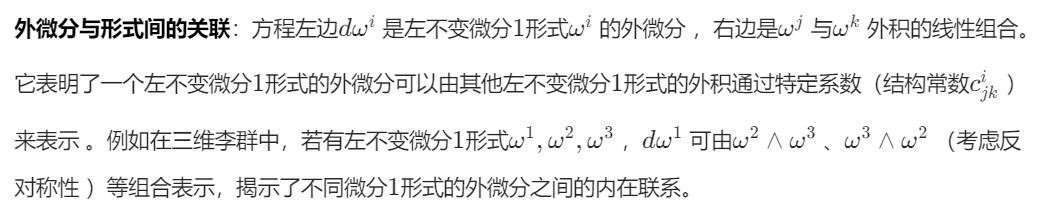 反映流形局部信息:外微分本身刻画了流形上微分形式的变化情况。结构方程通过这种关联,反映了李群作为一种特殊流形在局部上的几何和拓扑信息 。比如通过结构方程可以分析李群上的微小 “形变” 或 “弯曲” 情况,类似于在欧氏空间中通过导数研究函数的变化,这里是通过外微分和结构方程研究李群上微分形式的变化,进而了解李群的局部性质。