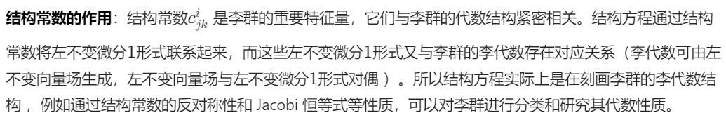 群运算与形式的联系:左不变微分1形式的左不变性与李群的群运算相关。结构方程在这种背景下,体现了李群的群运算(如左移 )与微分形式运算(外微分、外积 )之间的深层次联系 。它表明在李群的群结构下,微分形式的外微分行为是如何被决定的,进一步揭示了李群的整体结构和性质。
