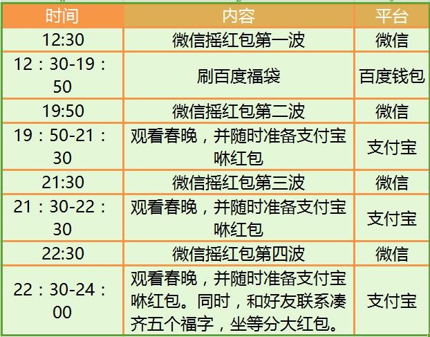为了让大家能科学安排时间,红包娱乐两不误,身患红包强迫症的小编特意编制了新年红包攻略,便于各位安排抢包日程。