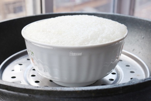 8.水烧开后,将糯米饭上锅隔水蒸20分钟