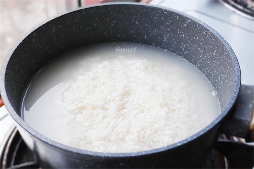 2.浸泡好的糯米入锅中煮制,因为糯米提前浸泡过,加水量略少于平时煮米饭时的水量。