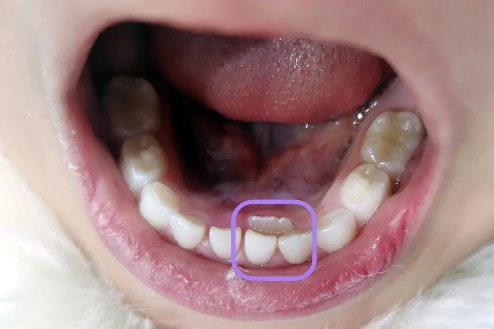 “双排牙”顾名思义就是长了两排牙齿(图1)。前面这排是原来的乳牙,它到了换牙的时候不掉;而替换的恒牙到了该长的时间它又要长出来,没有地方长了,只能在附近其他地方长出来,就形成了双排的样子。