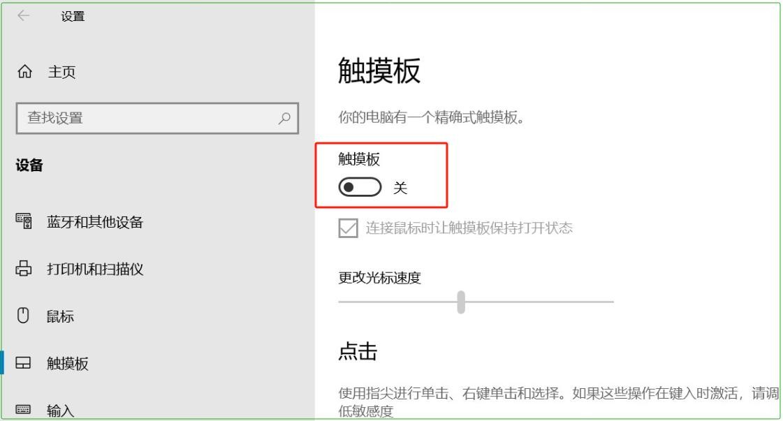 一般情况下,我们使用电脑都是用鼠标来操作的,那么此时想再次启用触摸板功能是很简单的,只要进入上述的画面中,点击“触摸板”的开关就可以把启用了。