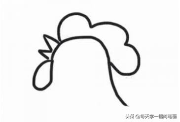首先在画面靠上的位置画出一个弧线形的公鸡脑袋,右侧画出尖尖的嘴巴,以及一个椭圆形的下巴,如图;在头部上方画出类似云朵状的鸡冠