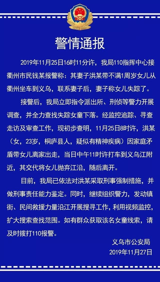 当天,孩子妈妈找到了。据孩子妈妈洪某交代,当天,她带着孩子打车到义乌江附近,随后将孩子抛弃江沿,自行离开。今天上午,义乌市公安局发布警情通报