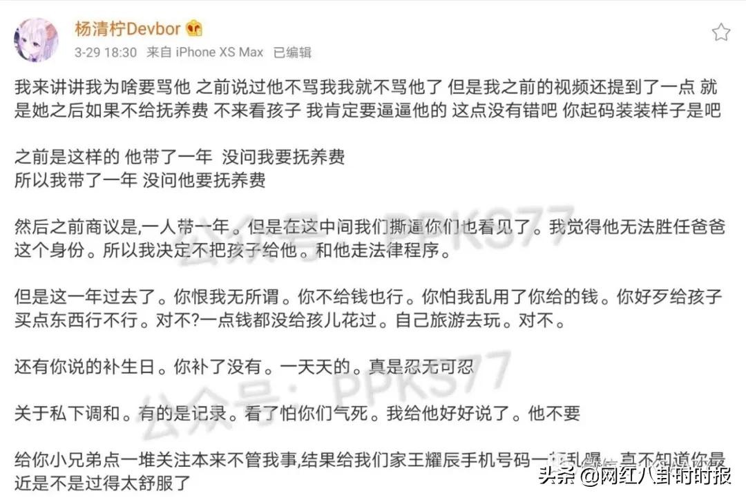 不久杨清柠再度发文解释为什么要diss王乐乐,主要一大原因就是拒付孩子抚养费,