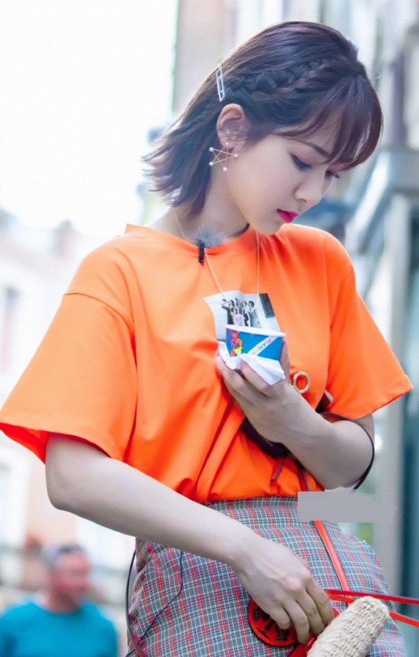 注意看她当时穿的裙子了,她穿的是一条这种格子的包臀裙,上面还有一些橘色的格子装饰,因此就更独特,搭配的还有一个比较减龄的包包,因此就更加时髦了,看上去还比较少女!