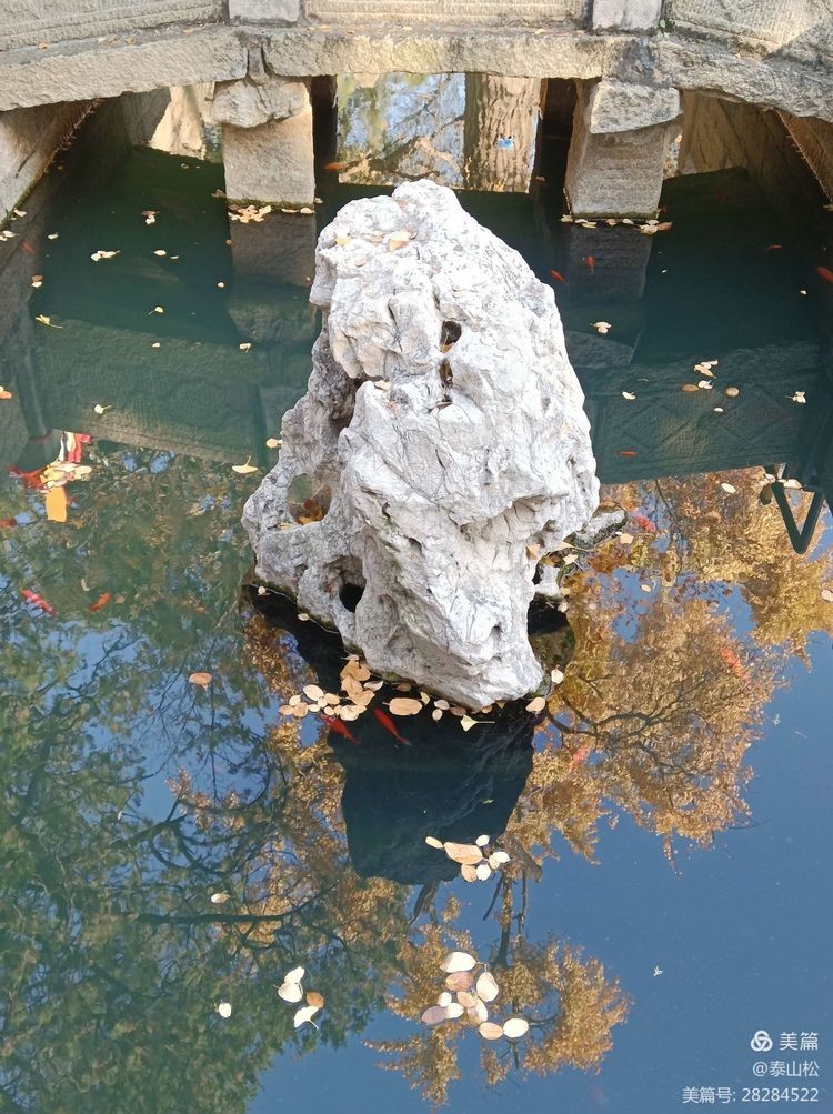 王母池,假山、落叶、游鱼相映成趣。