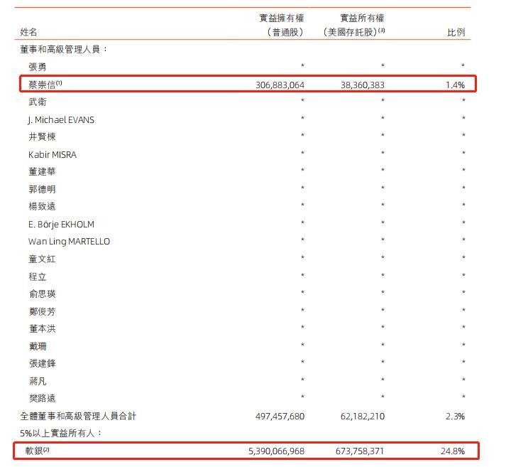 从年报中的数据可以看到,软银集团持有阿里24.9%的股份。而阿里实际的二号大佬蔡崇信仅仅持有1.4%的股份,比马云还要少很多。整个董事会及高管持股比例为2.3%。这里可能有的小伙伴要问了,马云去年年底还持有4.8%的股份,怎么突然现在整个董事和管理团队一共才持有2.3%的股份了呢?难道马云已经清空了阿里的股票?