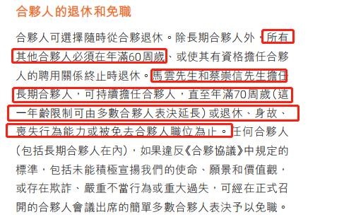 那么这两位大佬什么时候不再担任合伙人呢?网上有观点说他俩是终身合伙人,这个说法不太准确。按照年报上的公开信息,其他合伙人60岁退出,但马云和蔡崇信可以在70岁才退出。同时,如果只要半数以上合伙人同意就可以突破年龄限制,延长退出的年龄。所以只要两位大佬愿意,开个合伙人会议直接延长退休年龄就可以了。