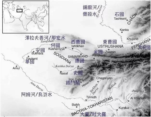 中亚地理分区图,阿拉伯最东部为呼罗珊地区,唐朝主要控制费尔干纳盆地,昭武九胡主要位于河中地区