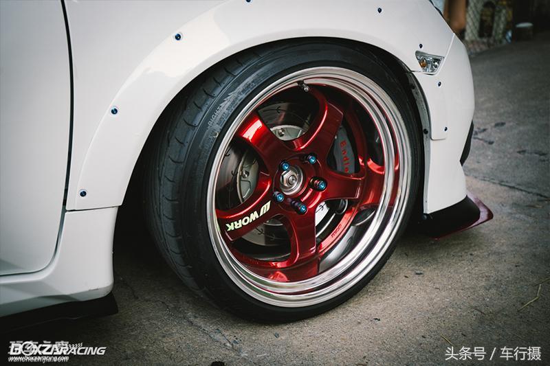 行走系统方面,改装了Work的S1款轮毂,电镀红的五幅轮毂搭配Endless 334 MM 刹车盘,新思域的迷人大脚就这么诞生了。