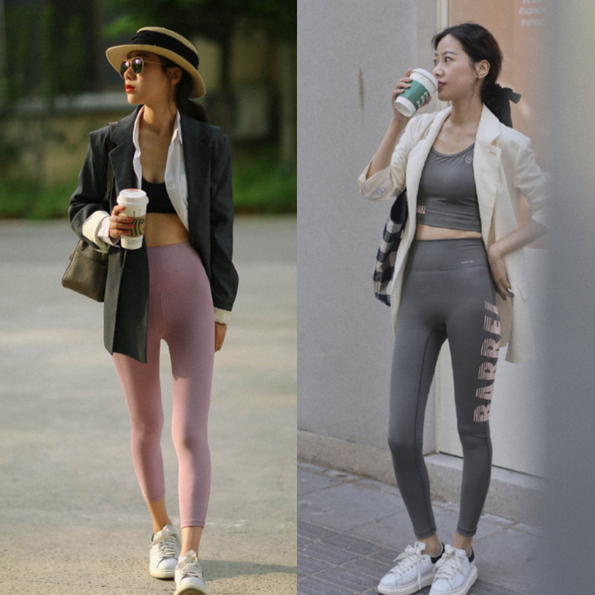 喜欢吸睛度高一些的穿法,那就可用经典色系的西装和“彩色系”瑜伽裤搭配;例如图上(左图)这身“灰色西装+粉色瑜伽裤”的搭配,既有强烈的色彩感,又不失高级大气的感觉,养眼又吸睛。