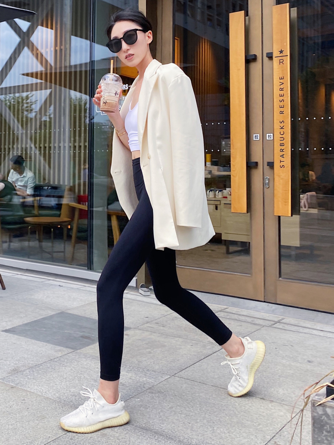 如果更中意简约、大方一些的穿法,更推荐你尝试“经典色系”的搭配,像图上这种“白色西装+灰色瑜伽裤”的组合就非常值得借鉴。另外,白+黑、黑+灰也可尝试哦!