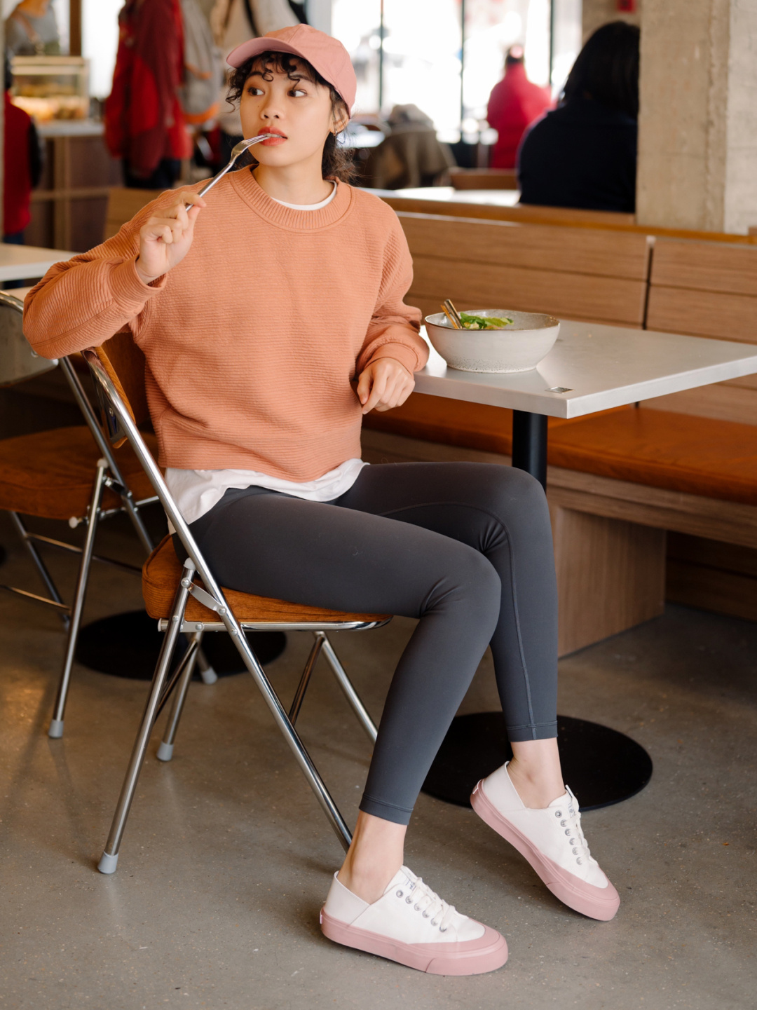 卫衣的版型宽松,且带有一定的减龄感,和瑜伽裤搭配在一起,不仅能削弱瑜伽裤的呆板、老气,还能打造出“上松下紧”的反差,显瘦又显腿细。