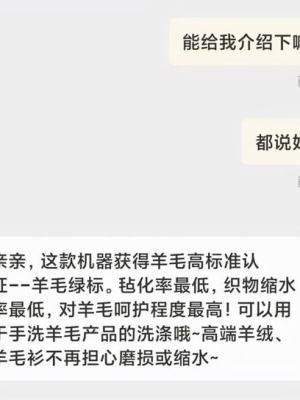 1:绝大部分高端洗衣机都会有科普羊毛洗护功能衣服,专门的羊毛洗程序都是通过模拟手洗,使用更加轻柔的洗涤方式避免羊毛毡缩。
