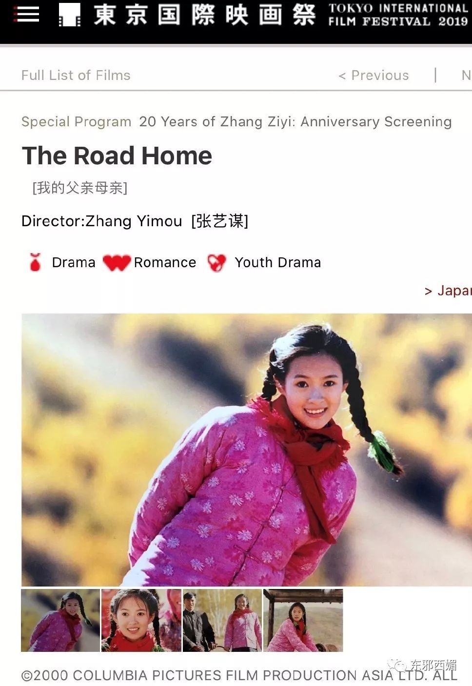 今年是章子怡从影20周年。为此,戛纳重映《卧虎藏龙》致敬,东京电影节则重映《我的父亲母亲》致敬。