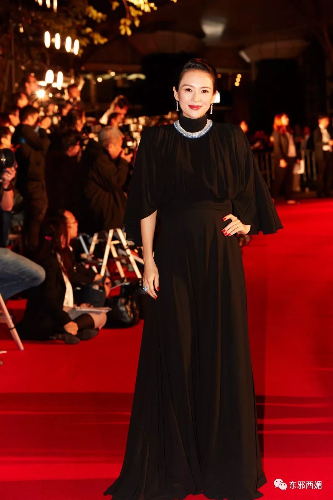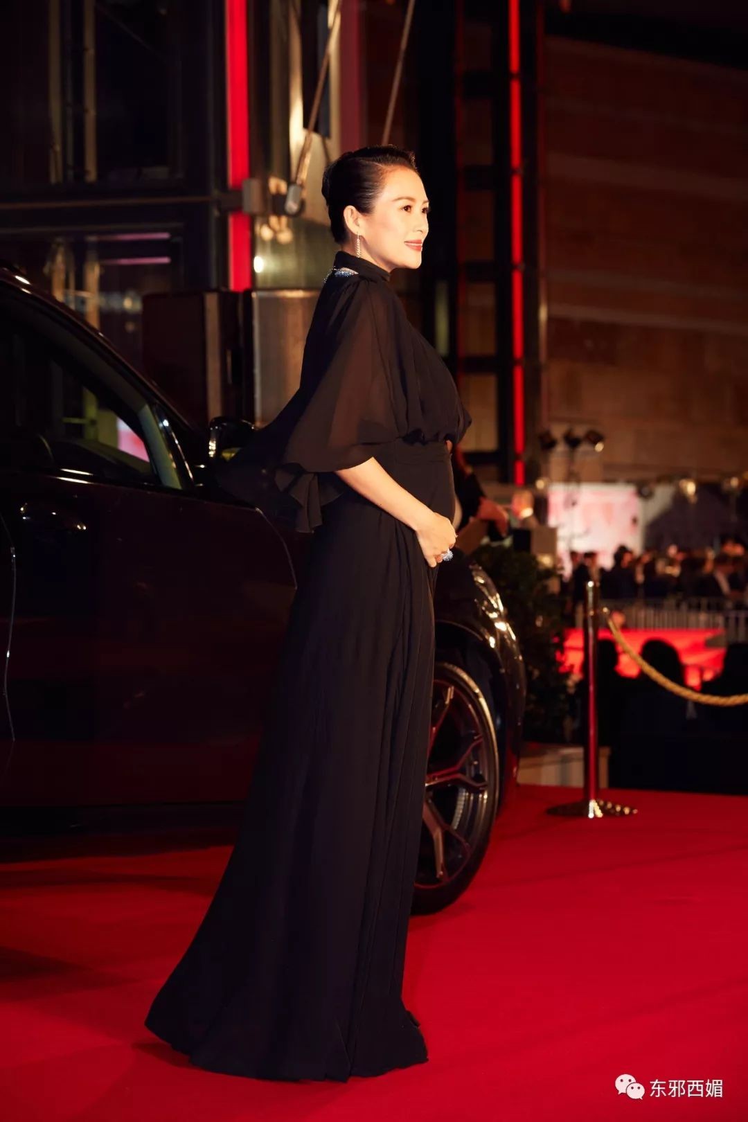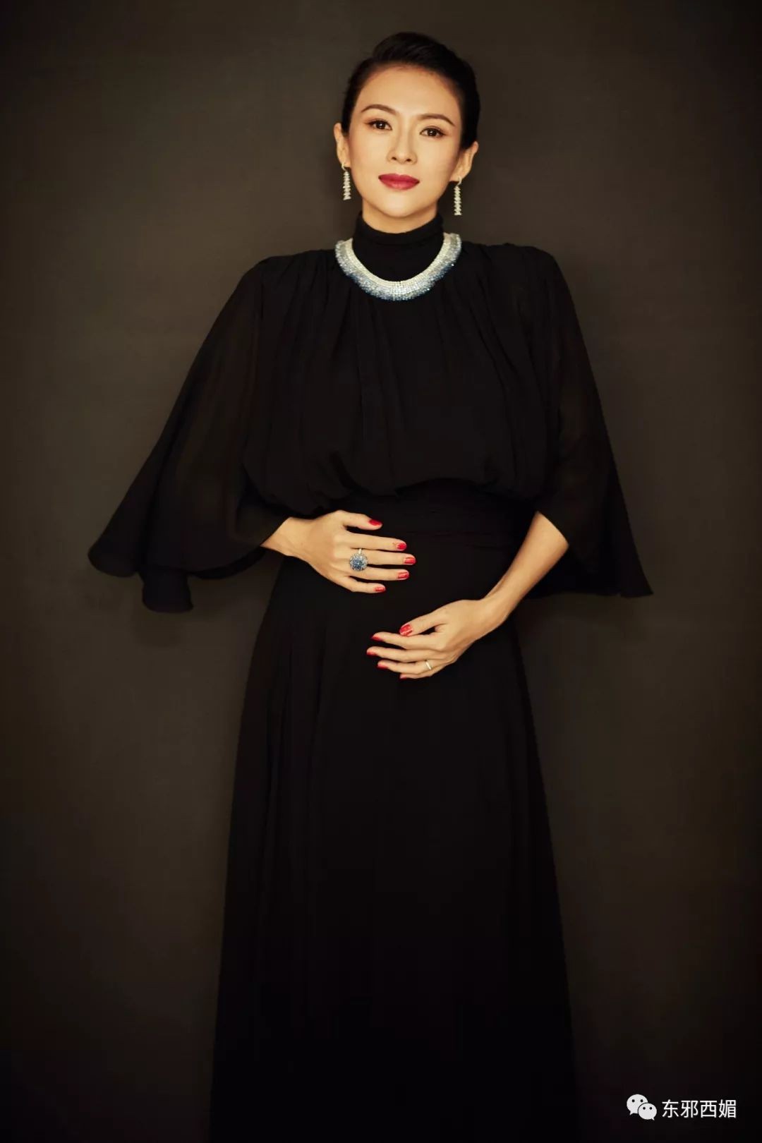 一袭黑裙珠宝闪烁的她,很美。而比珠宝更吸引眼球的,是这用手护住孕肚的姿势。