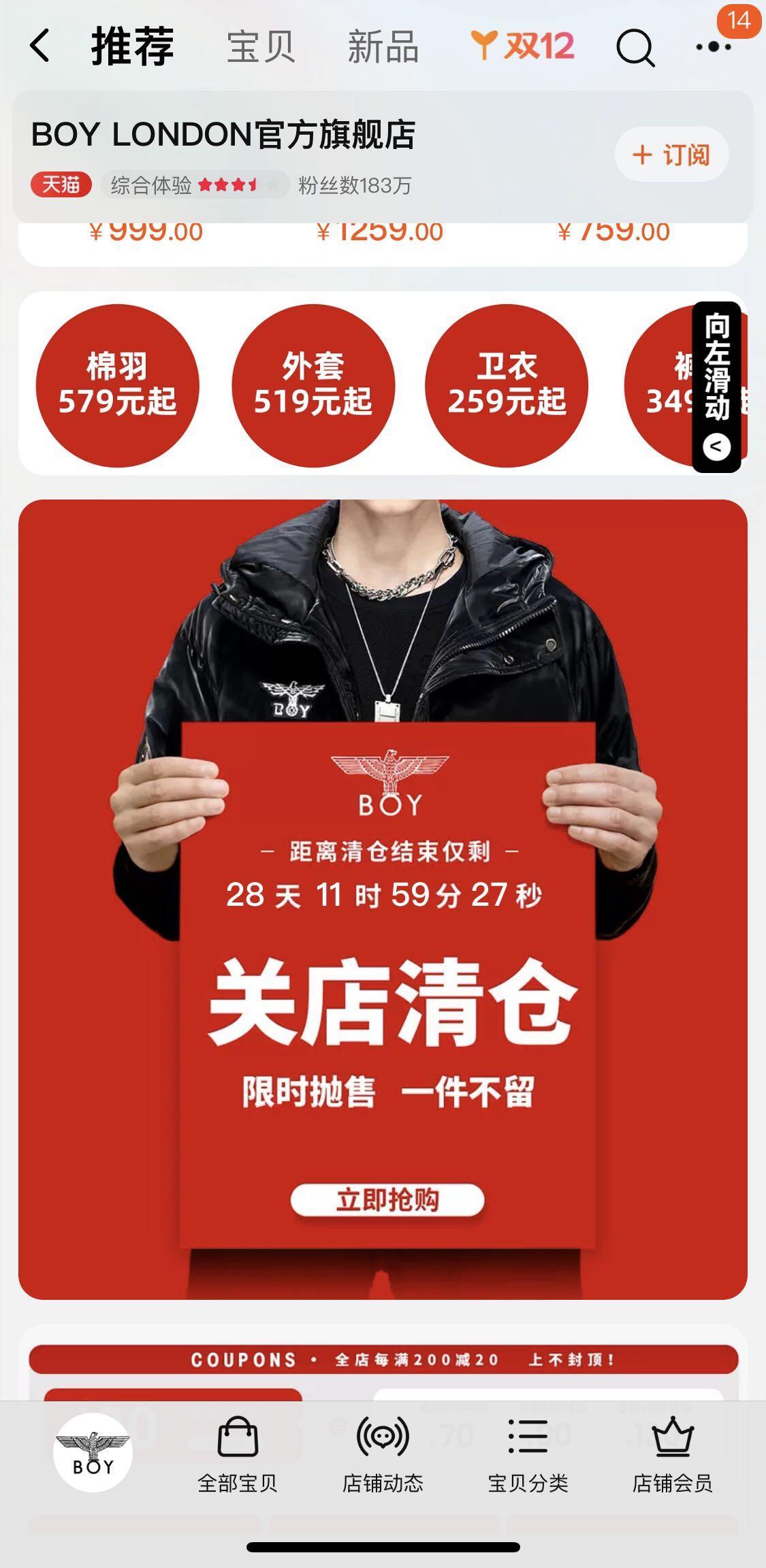 然而,界面时尚近期发现,Boy London在京东和天猫旗舰店均发布了关店清仓的消息。Boy London天猫旗舰店还设计了清仓闭店倒数日历,预计将于12月底正式关闭运营。该品牌设置了三到五折的低价优惠,并打出“限时抛售,一件不留”的口号。