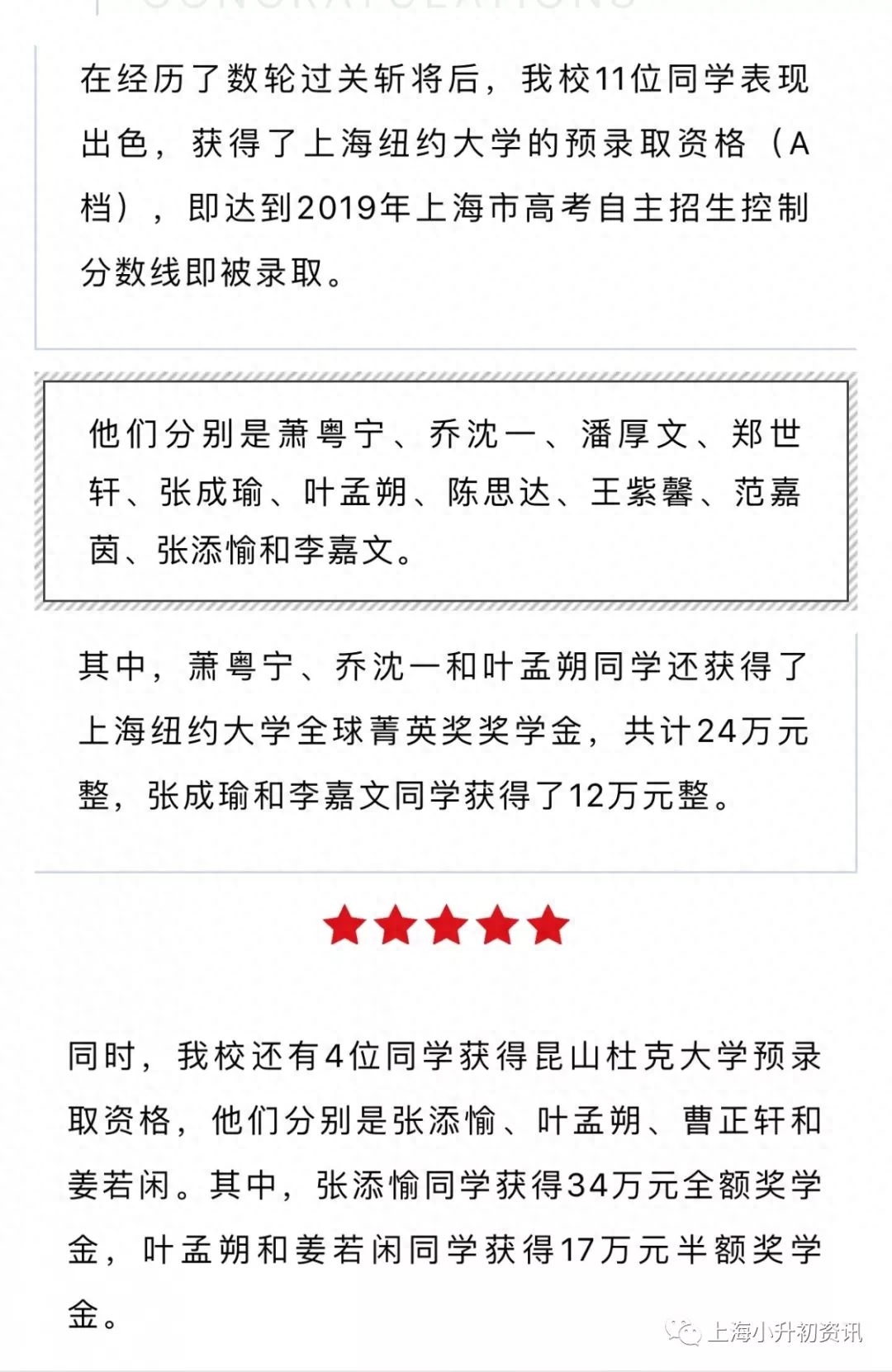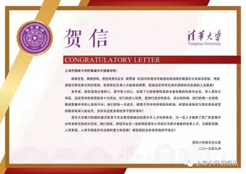 来看看今年学校晒出的来自清华大学、复旦大学、上海交大、香港中文大学、上海外国语大学等高校的录取贺信: